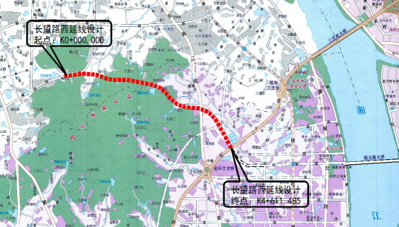 長望路西延線位于湘江新區(qū)范圍內,路線呈東西走向。道路西接黃金大道,往東沿谷山森林公園北側山體埡口,穿過龍湖湘風原著,往東接現狀金星北路,再向東南連接現狀西二環(huán),道路全長4.611KM,并對長望路(西二環(huán)-觀沙路)段進行了改擴建設計,長度0.611KM,金星路、黃金大道立交范圍內的主線及輔道進行改造。本標段范圍為K0+000-K1+520。其中包括跨線一座、下穿式矩形框架橋一座、地下人行通道一座,線路設計為城市主干路、設計車速60km/h。