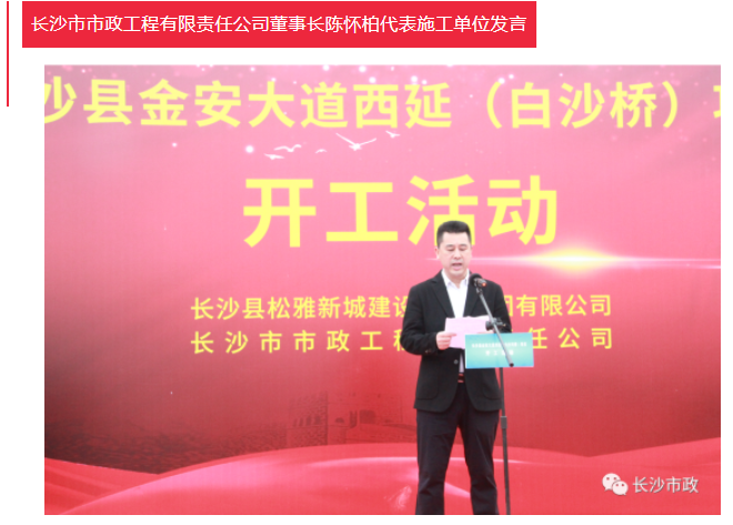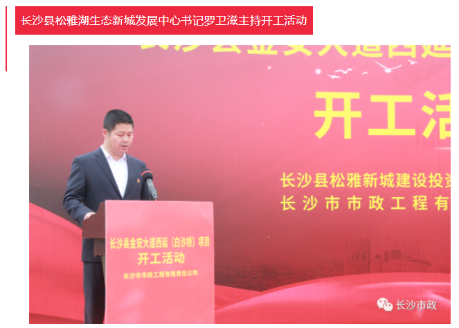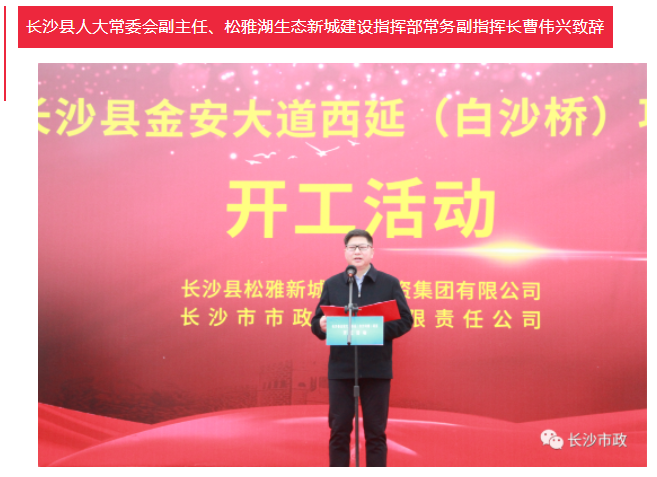 4月19日上午,長(zhǎng)沙縣金安大道(含白沙河橋)西延項(xiàng)目開(kāi)工活動(dòng)隆重舉行。長(zhǎng)沙市人民政府副秘書(shū)長(zhǎng)張躍先,長(zhǎng)沙縣委副書(shū)記、縣長(zhǎng)、松雅湖生態(tài)新城建設(shè)指揮部指揮長(zhǎng)陳永高,松雅湖生態(tài)新城建設(shè)指揮部常務(wù)副指揮長(zhǎng)曹偉興,長(zhǎng)沙市市政工程有限責(zé)任公司董事長(zhǎng)陳懷柏出席活動(dòng)。長(zhǎng)沙縣松雅湖生態(tài)新城發(fā)展中心書(shū)記羅衛(wèi)滋主持開(kāi)工活動(dòng)。